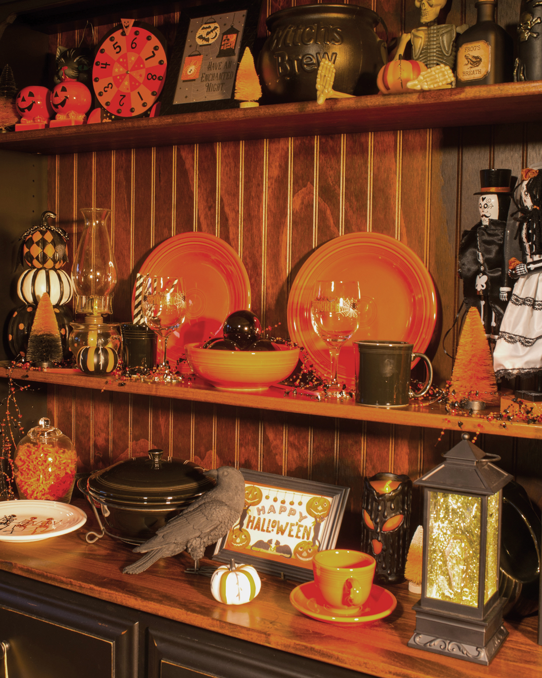A glass-doored cabinet holds many of the vintage papier-mâché pumpkins and other seasonal decorations that Gary favors.
