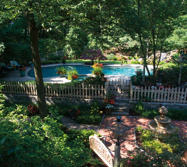 Thirty years ago, John and Eileen Smith built their dream home on the outskirts of Elizabethtown. Traditional in style, it sits on eight, partially wooded acres through which the Conoy Creek flows. John, who loves landscaping, consulted with Ray Boltz of Erb Brothers Landscaping for advice on transforming the rear of the property into a unique garden setting. John and Ray’s ideas translated into a free form Sylvan pool, a spring house-inspired structure that holds the pool’s mechanicals and a patio. Flower beds also materialized. “I’ve always liked being outdoors,” John says, crediting his parents for that area of interest. “They loved being outside and working with their trees and flowers. I enjoyed helping them,” the Terre Hill native says of digging in the dirt and mowing the grass.