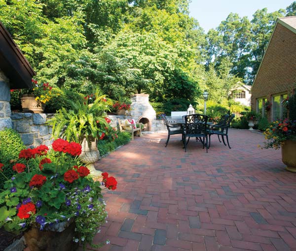 The patio was expanded during the renovation to provide more space for outdoor dining and entertaining. The fireplace was added, as was a retaining wall that unites this space and the pool area.