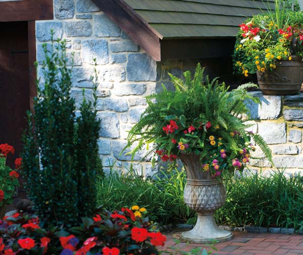 Dozens of colorful container gardens highlight the outdoor-living area. “I’ve never bothered to count them, so I don’t know how many I have,” John reports. He buys his containers “here, there and everywhere.” He especially loves the cast-iron containers that receive a fresh coat of black paint every spring. They remain outdoors year around and are used as the foundation for lighting displays at holiday time. The other containers go into storage in the fall.