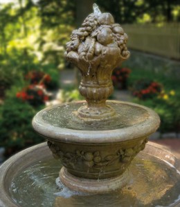 Wrought-iron and picket fencing echo Charleston styling. A requisite fountain is surrounded by a mini-sized formal garden. Colonial-style lampposts and Chippendale-inspired benches add yet another touch of Charleston to the courtyard.