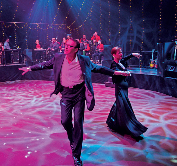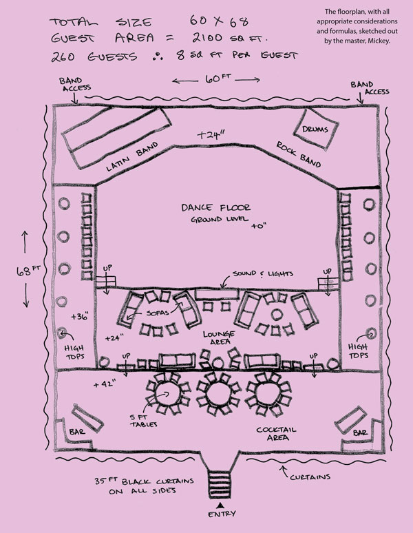 A few hours later, the rooms suddenly went dark – a signal that the next phase of the party was about to begin. Guests flowed to the ground floor, where many paused for a photo op in front of the Rolling Stones’ iconic tongue (a typical part of the business’ décor, left over from a Rolling Stones’ benefit concert in Toronto). In the huge space where similar staging and scenic elements are created every day, Mickey had designed a room within a room, about to be discovered by his guests as they climbed a set of stairs to pass through a black curtain, salsa music calling to them from the other side. They entered a party room of 4,352 square feet – carefully calculated to provide 8 square feet per guest, the cocktail-party ratio that feels pleasantly crowded but not crushed.
