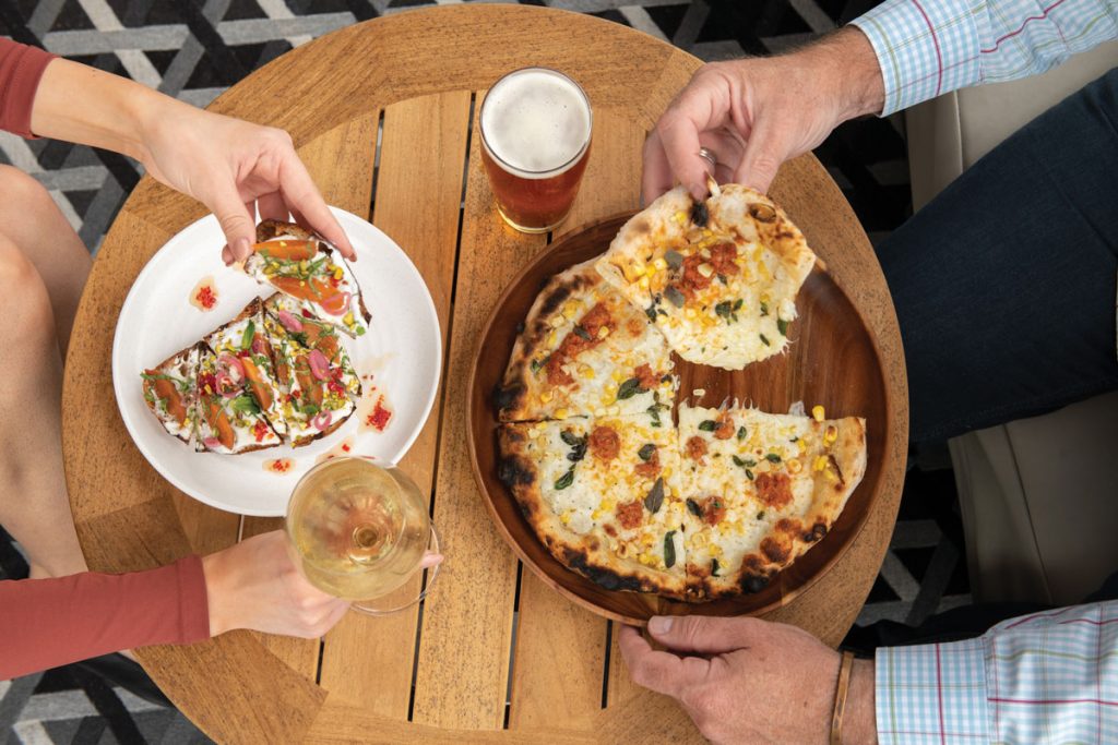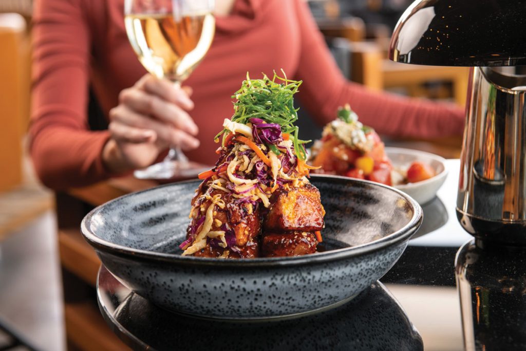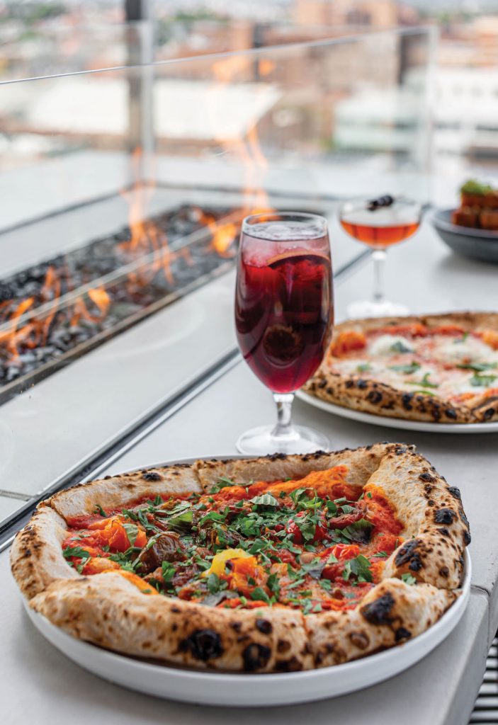 Offering year-round indoor and outdoor dining, The Exchange opened in July 2019. Indoors, floor-to-ceiling windows offer panoramic views of the city. “People like to walk around and check out the views,” says Ryan McQuillan, executive chef for both The Exchange and Plough, the Marriott’s new ground-level restaurant.