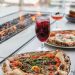 The décor’s modern flair entails a mix of casual seating and low cocktail-type tables. Ryan says guests often gravitate to a low white banquette in the center of the room that’s positioned under a large lighting fixture. He also shares that guests like to watch food being prepared in the display kitchen that features a wood-fired oven.