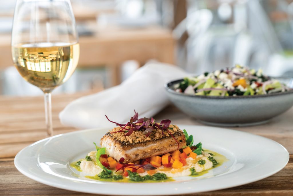 The spacious restaurant has a warm, casual feel. A dual-sided fireplace in the lobby also fronts onto the lounge, which offers seating at the bar and in cozy booths. An adjoining garden room seats up to 70. It’s a four-season room, and all of the doors open onto a 70-seat patio with a firepit.