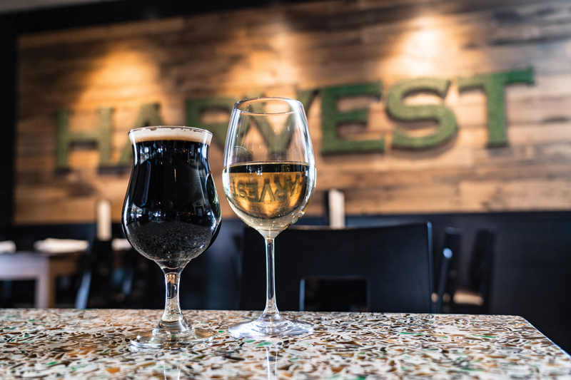 Harvest’s bar menu complements its local mission. Beer selections are hyper-local, while spirits such as vodka and gin are as local as possible. The wine list focuses on wineries with sustainable growing practices; 50 wines are available by the glass. “Our servers are well trained on wine pairings. We have a meeting every day before dinner service to discuss specials and wine pairing,” she says.