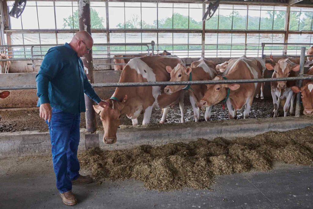 Kevin Stoltzfus stops to pet one of the Guernsey cows as he makes his way through the barn. According to Kevin, cows can be extremely curious around people, particularly if they’ve been around them from birth.