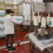 Cindy Miller bottles Golden Guernsey milk at Yoder’s Country Market. Whole milk must be a minimum of 3.25% milk fat by weight, and skim milk is set at .5% milk fat. Labels are applied to plastic milk jugs by hand. Milk is available in glass bottles.
