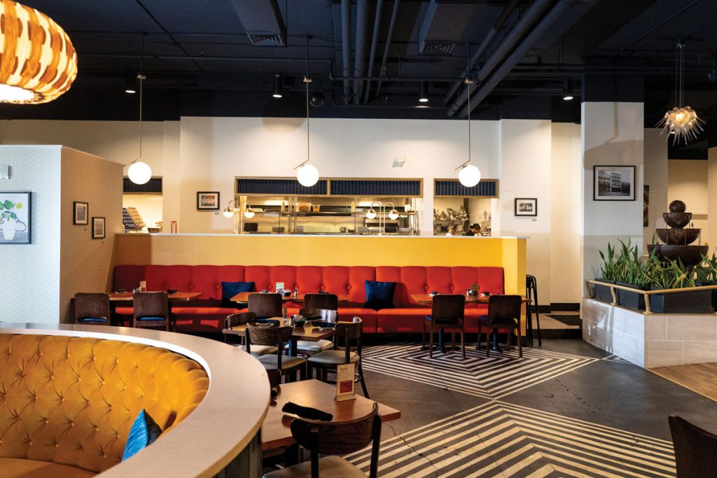 Creating the look and mood of the restaurant fell to interior designer Noelle Turco of Red House Design Company. She was ultimately inspired by the restaurant’s name and history. (President Lincoln once delivered an address from one of the original hotel’s balconies.) “When I design projects, I like themes. Here, the restaurant tells a story – when you walk in, the lights around the bar are reminiscent of a railroad station,” she says of the fact that during the 1800s, Lancaster’s train station was located in the vicinity of the hotel. “There’s also a mid-century-modern look,” she continues. “We’ve incorporated plants, a fountain and rich colors to create a feast for the eyes. I found historic photos of the area or historic events like presidential visits and hand-colored them to add pops of color.” A modern-industrial look was added to the mix courtesy of the exposed ductwork that’s painted black and blends into the ceiling.