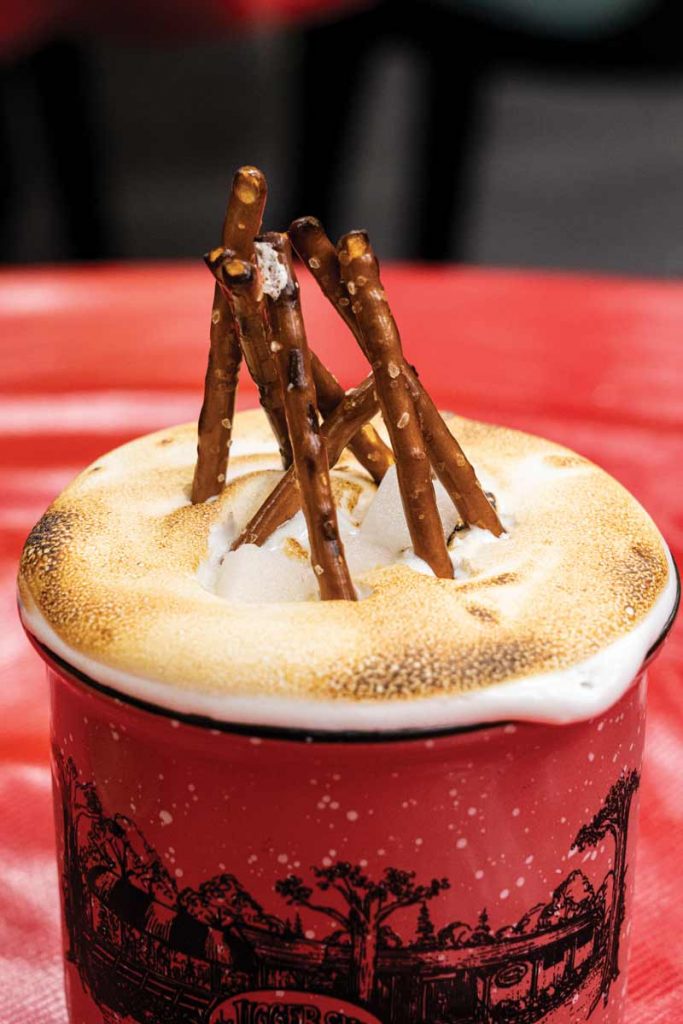 Since it opened, The Jigger Shop has been known for outrageous ice cream desserts. Baked Alaska is served flaming, as is the Campfire S’more Sundae and Sticky Bun Flambé (beignets used in the dish are made on the premises).