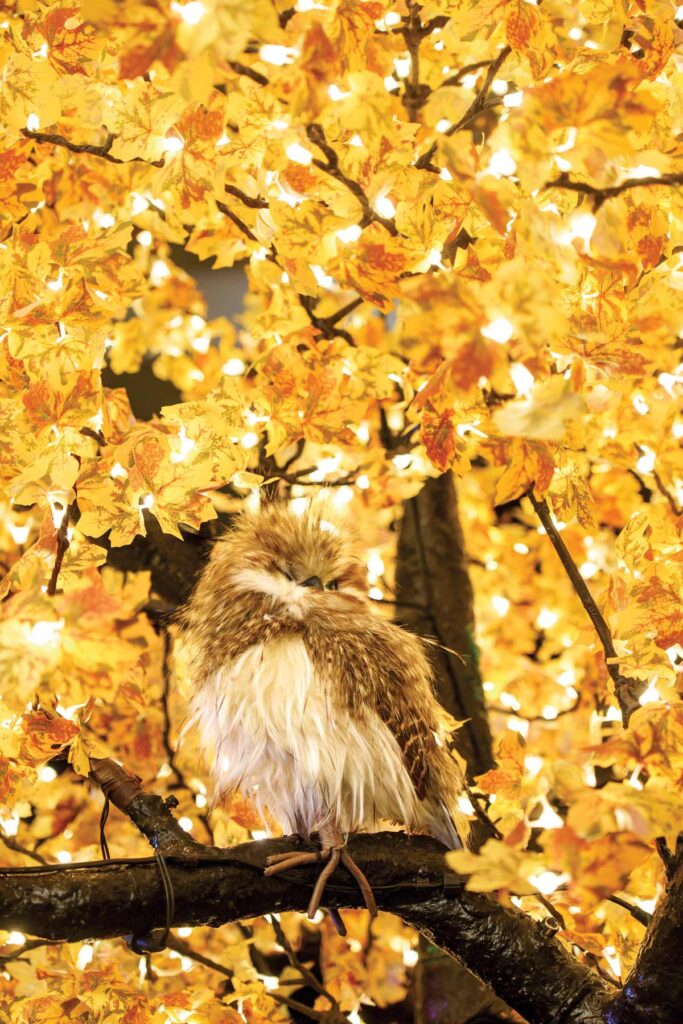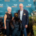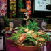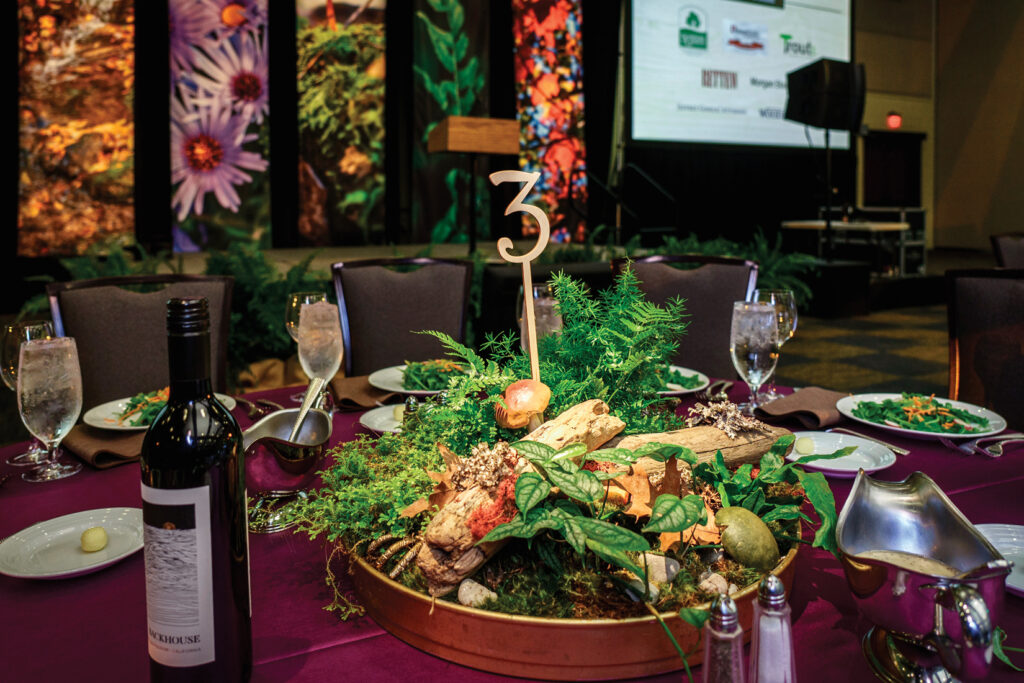 While arriving guests sipped bubbly in the reception area, surrounded by Tim’s traditional landscapes of custom-made dandelions, dried wildflowers, faux cattails, stuffed bears and other woodsy critters, the “go big” concept awaited in the ballroom. A 12-foot tree emblazoned with gold lights soared overhead, aglow in the center of the ballroom’s bar. Concealed behind a black curtain, to be revealed at the call to be seated in the dining area, 14-foot vertical banners displaying local photographers’ images of the Conservancy’s lands energized the stage, theatrically lighted by live event production professional, Shumaker PDT.