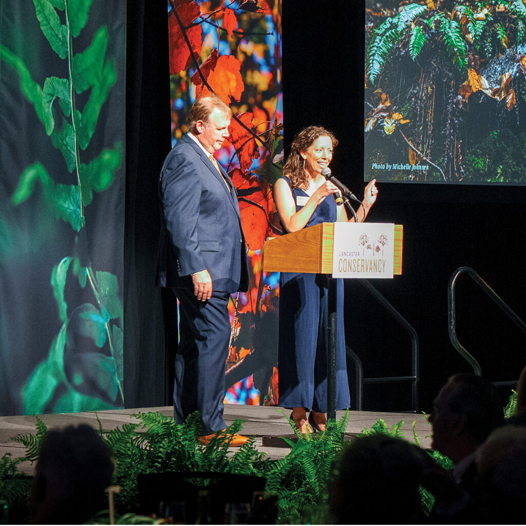 A surprise announcement by the Conservancy’s president and CEO, Fritz Schroeder, inspired guests to muster even greater support, sharing news of the addition of 43 acres of forest to the Conservancy’s preserved areas. Thanks to the landowners, Robert Pfannebecker and his wife, Nancy Fornoff, Kelly’s Run Nature Preserve will surpass 500 acres of forest with a streamside hiking trail for the public to enjoy near Holtwood in southern Lancaster County.