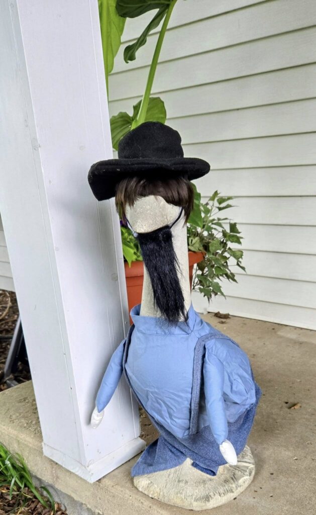 Of course, this being the 21st century, goose fanciers are bonding via social media. According to Morgan’s story, three years ago, Ohioan Erica Gross purchased her first home, prompting her to remember the goose that stood watch on her grandmother’s porch. She was determined to add one to her own porch. An aunt found one at a garage sale and Gross set out to clothe it, thus establishing an online connection with other goose-loving enthusiasts. Gross went on to establish the Porch Goose Club of America in 2022. Today, its Facebook followers number 240,000+. Goose lovers also populate Pinterest, as well as eBay, Etsy, Amazon and Gaggleville, among hundreds (probably thousands) of other sources.