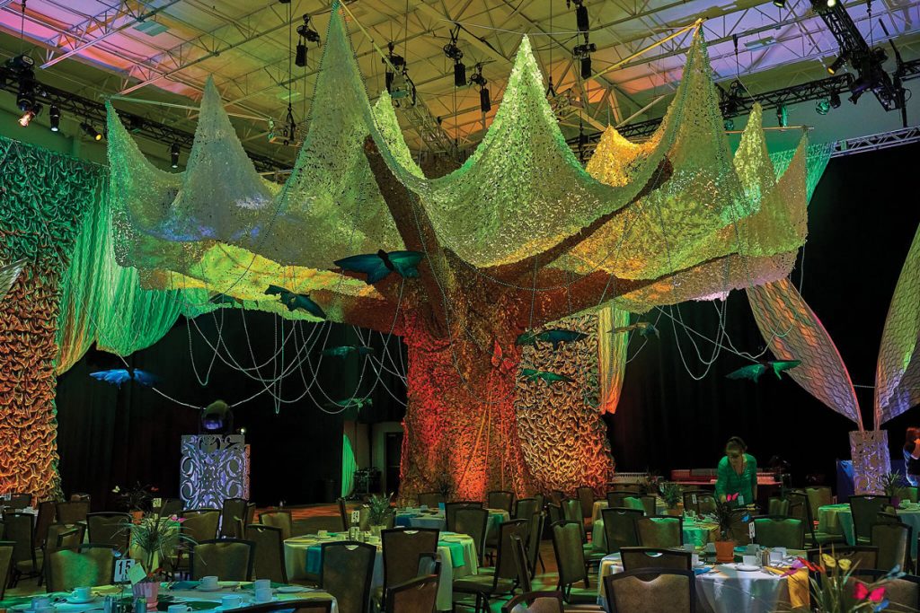 Inspired by last year’s 50th anniversary of the lunar landing, Cosmic Bash 2020 will boldly go where no Bash has gone before: to outer space. Creating Cosmic Bash Goes Galactic began months ago, with Tom and his ATOMIC design team imagining ways to interpret the established theme into a flow that incorporates all the party’s elements – the table layout of the sit-down dinner for 400, the bars, silent auction tables, stage and a breathtaking entrance. “The ATOMIC team works at finding unique ways to use the products on our shelves, while creating some unique custom ‘wow’ elements to set the stage,” Tom explains. Impactful elements, indeed. Past examples include a larger-than-life suspended jellyfish, huge rainforest leaves and a tropical tree canopy.