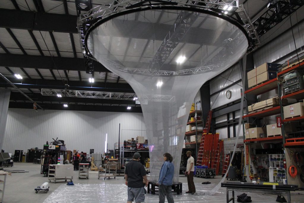 The weather theme in 2018 included 150 umbrellas and a dramatic 25-foot moving tornado. The fabric tornado was created by ATOMIC’s set-construction team in their Lititz facility.