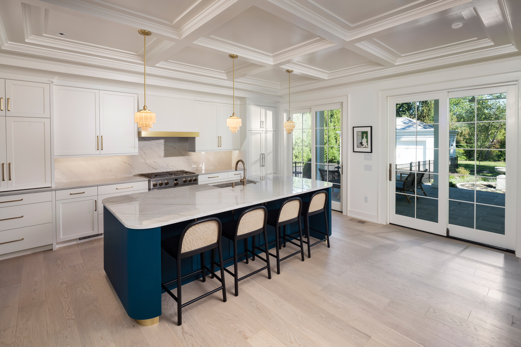 The homeowner’s love of Art Deco is reflected in the kitchen, where a large island is defined by curved reeded panels that are painted a vivid shade of blue. It’s complemented by gold accents and period lighting. Jon credits KBE Design Build for interpreting the desired styling. To bring a sense of neoclassic architecture to the space, a coffered ceiling completed the design. Modern living enters the picture thanks to ample storage and a wall of patio doors that connects the kitchen with the spacious outdoor living area.