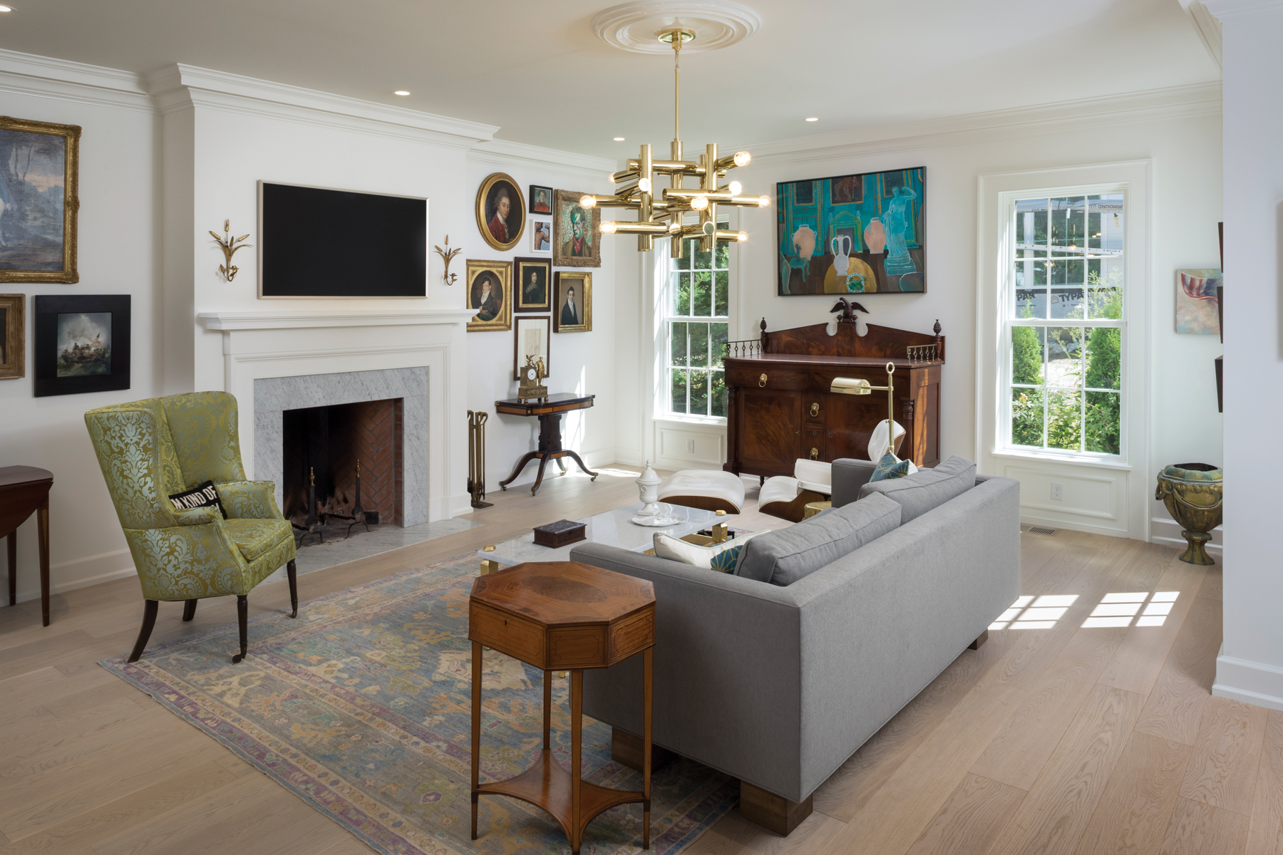 In the living room, a modern sofa and lighting fixture pair perfectly with period furnishings and artwork.