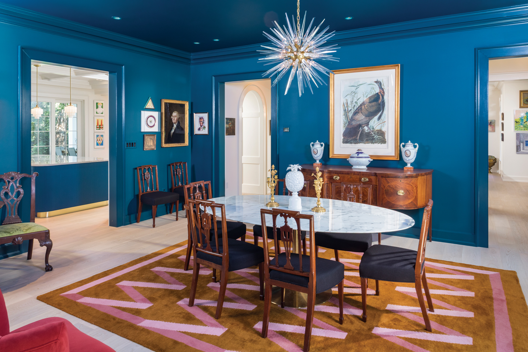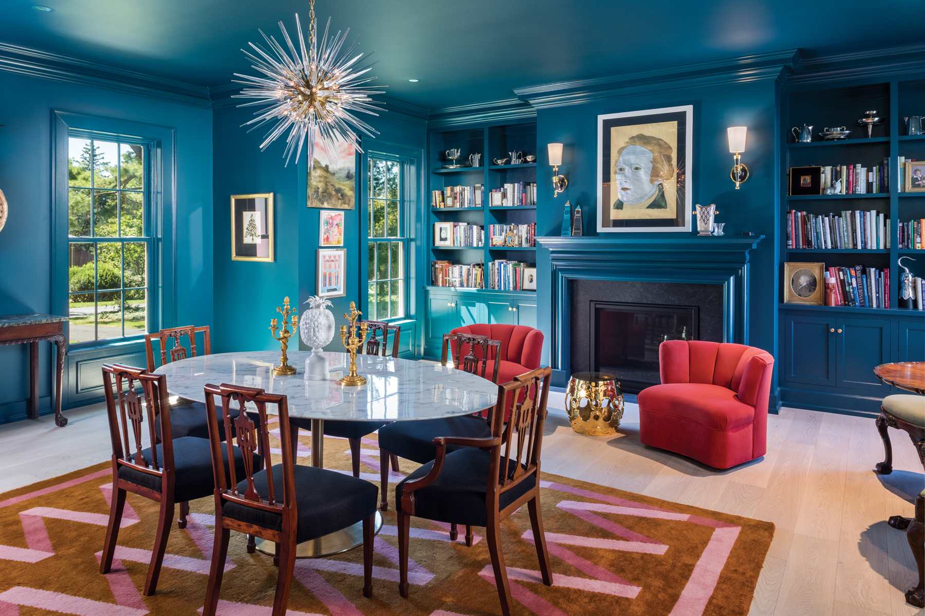 The concept of multitasking rooms has given way to a design trend that centers on combining a dining room with a library to create a more useable and interesting space. The homeowner refers to the décor of his dining room-library as “Federal meets Art Deco.” The orange chairs are from the 1930s. The portrait over the fireplace is of Alexander Hamilton. Color drenching adds an element of drama to the room.