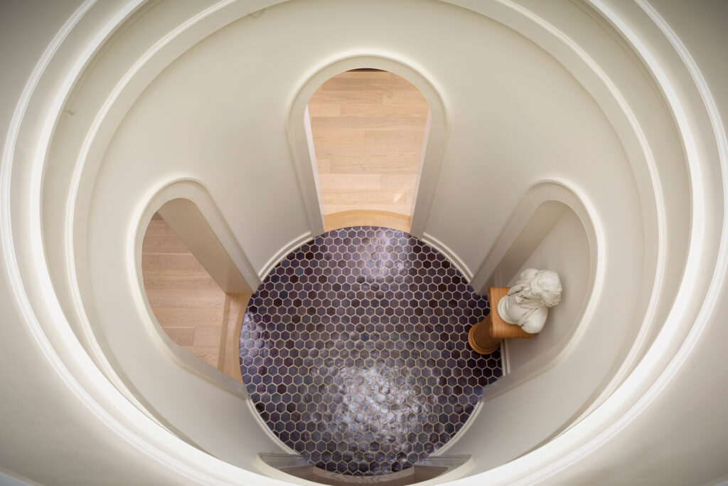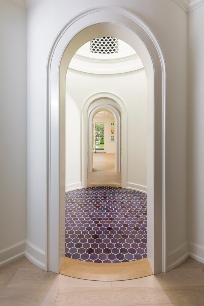 Art and furnishings such as a highboy and a chest he had inherited from an uncle, prompted the homeowner to request specific wall sizes that would accommodate his treasured pieces. Jon’s designs – notably in the living room – provided the specifications that were needed. Yet another request was to somehow incorporate the homeowner’s favorite color, purple, into the design. That was achieved by painting the front door that hue and tiling the floor of the dome in shades of purple and blue.