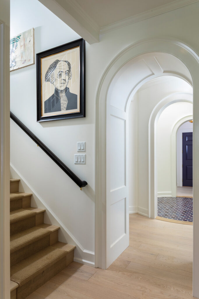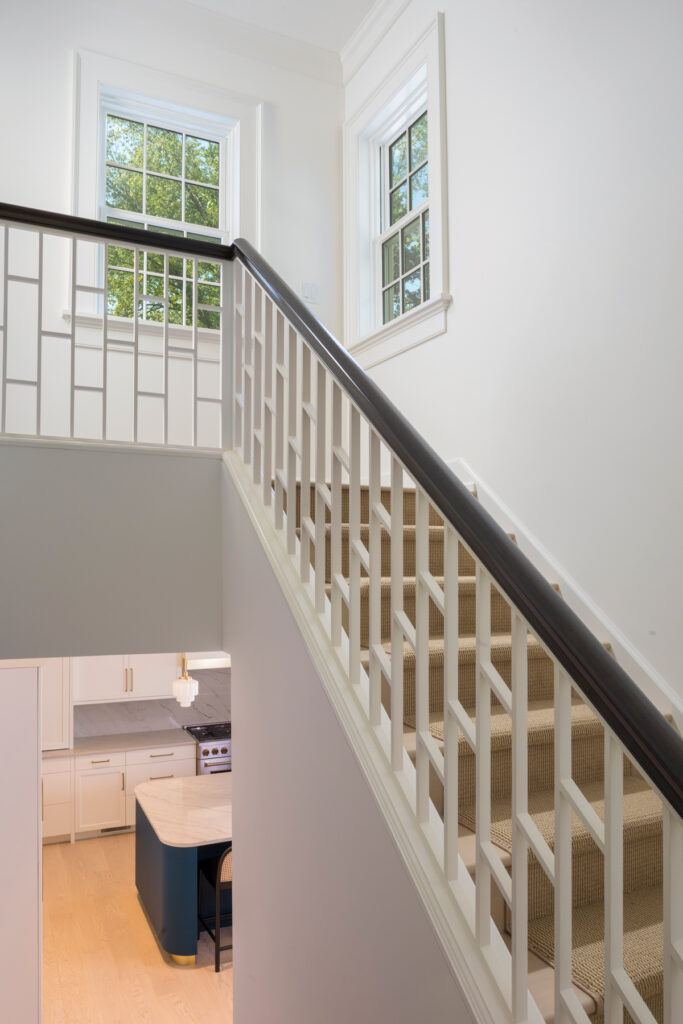 The staircase that leads to the second floor features a modern version of a Chinese Chippendale railing, which is widely seen in Virginia.