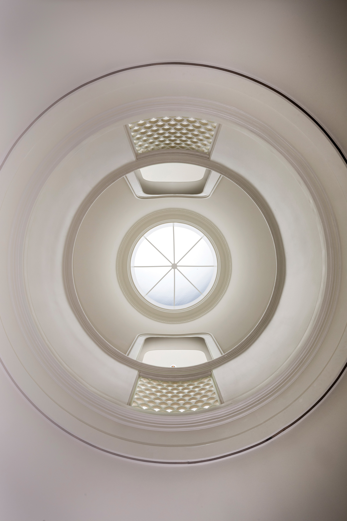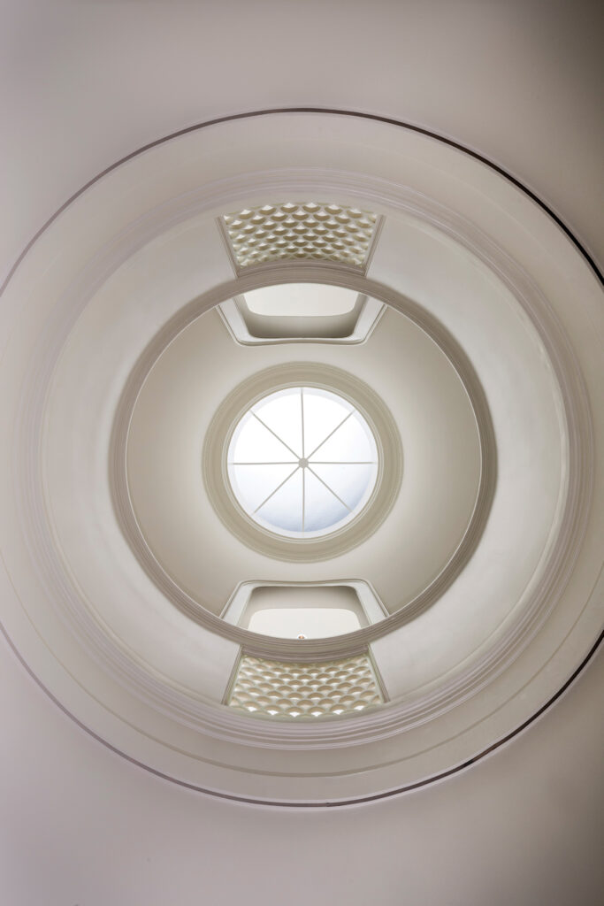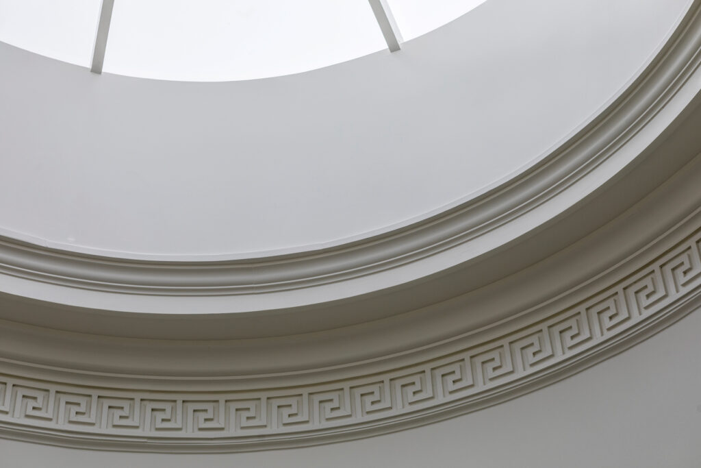 As for the dome feature, paying homage to the homeowner’s favorite aspect of Monticello – the iconic Dome Room – was a must-have. The challenge: how to create the intricate molding that would encircle its interior. “Flexible molding provided the solution,” Don says, adding, “GR Mitchell did all the millwork – and there was a lot – for the house.” The dome is topped with an oculus (Latin for “eye”) that admits natural light. The dome is further illuminated by LED lighting that curves behind the moldings. “It’s beautiful at night,” says the homeowner.
