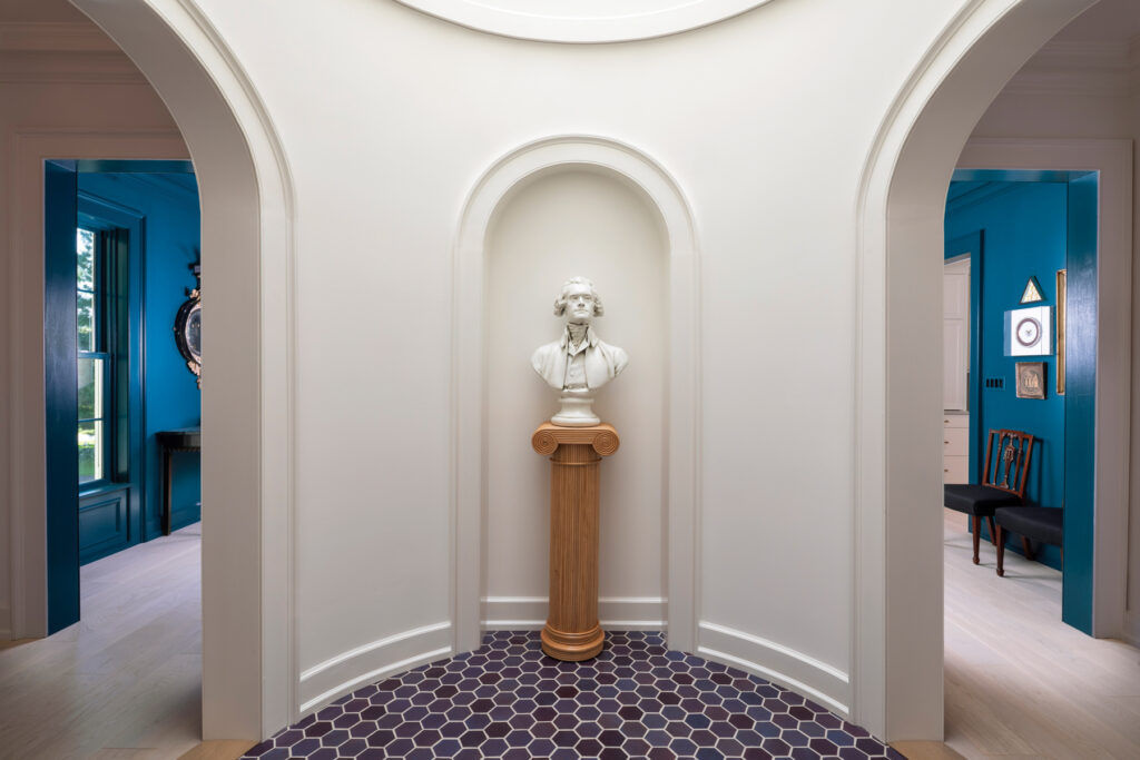 The dome feature is located just inside the entryway and travels upward to the roof level. It hearkens to the homeowner’s favorite aspect of Monticello, the octagonal-shaped Dome Room, which provided Jefferson with an 18th century version of a man cave. Three arched doorways punctuate the structure, as do several “windows” on the second floor. It’s topped with an oculus that admits light. Intricate molding distinguishes the interior of the dome. The purple-hued tiled floor conveys the homeowner’s favorite color. A bust of Jefferson is set into a niche.