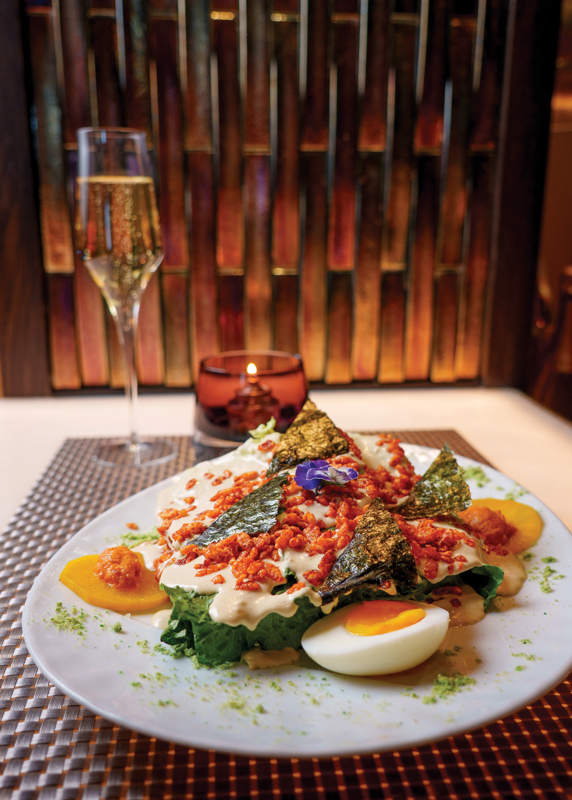 The Wasabi Caesar Salad is composed of Romaine spears, Japanese crispy rice, crushed wasabi peas, kim chi, pickled daikon, soft-boiled eggs, purple nori and wasabi Caesar dressing.