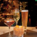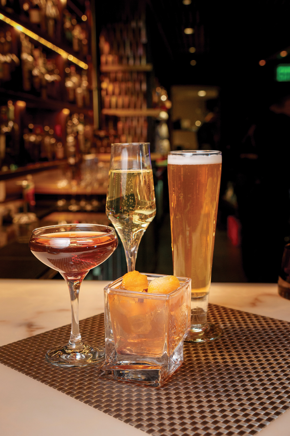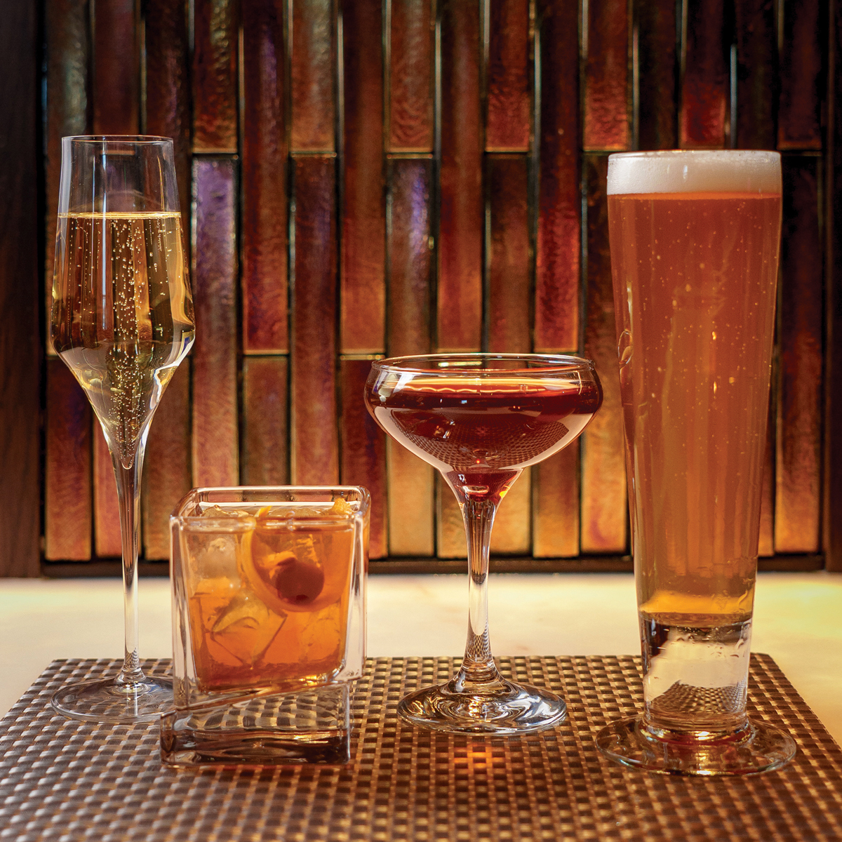 A sampling of Happy Hour beverages includes (clockwise from left): Maker’s Manhattan (made with Maker’s Mark Bourbon, Dolin Sweet Vermouth and Angostura Bitters); Bubbles (Roederer Estate Brut); a Belgian draft beer; and a Bulleit Old Fashioned (made with Bulleit Bourbon, simple syrup and Angostura Bitters).