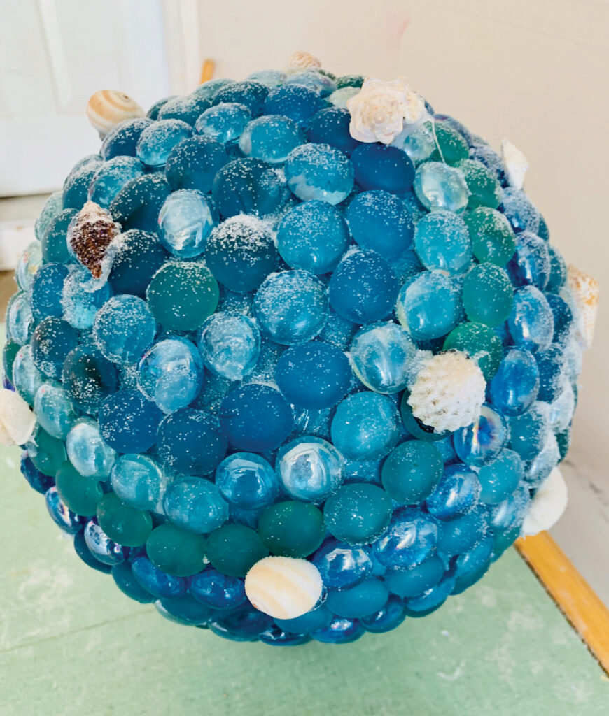 Last July, I also gifted Charlie with DIY garden art. Bowling balls embellished with glass “gems” kept showing up on my Facebook feed. I had two of my dad’s bowling balls, so I decided to give it a try. After doing a test run, I made one for Charlie that is decorated with turquoise glass and seashells (he’s into the coastal look). It’s special because the two often went bowling together.