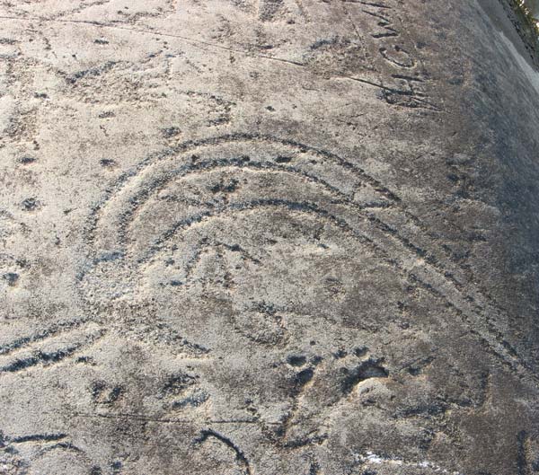 Parallel wavy lines close to the edge of the rock catch our interest. Do they represent snakes or possibly the river, or are they perhaps directional markers pointing to the position of sunrise on the equinox? A carving of another curvy serpent aligns itself with the location of sunset on the summer solstice and sunrise on the winter solstice.