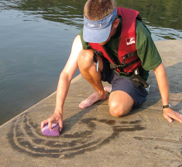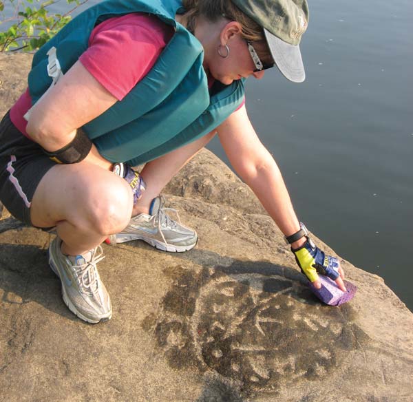 Awed by what we have found, we slip back into our kayaks and paddle upstream to a smaller island that reveals more petroglyphs. This is Little Indian Rock, the site of one of the largest concentrations of petroglyphs in the state. Some of the carvings are close to the water, and I am able to use my paddle to splash water on them. Engraved images of walking birds and four-legged animals begin to materialize.