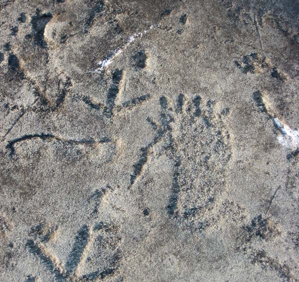 Depending on the angle of the sun, visitors could be standing directly in front of a carving and not know it. Therefore, the best times to view the petroglyphs are near sunrise or sunset, when the sun’s slanted rays create shadows along the edges of the carvings. To help reveal the artwork, we pour water from a plastic milk jug we have brought with us. The water splashes along the surface of the rock and fills the shallow engravings.