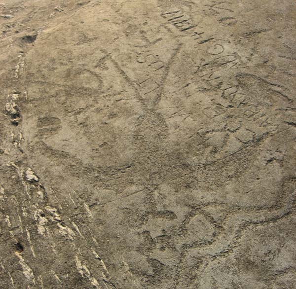 We paddle to the large gray-domed island that is known as Big Indian Rock. Its southern end offers an escape from the river’s steady current and provides a suitable location to land. We cautiously climb to the top of the smooth down-sloping rock. After signing the visitors’ log, which is stored in a large plastic bag, we start searching for the enigmatic carvings.