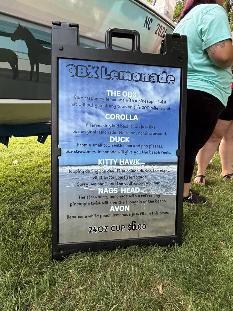 Lemonade? While attending a concert on a blistering hot evening at New Holland Memorial Park, I decided to buy some water. That’s when I noticed a boat emblazoned with “OBX Lemonade.” No, it wasn’t a mirage. It was a boat, complete with a pirate flag flapping in the breeze.