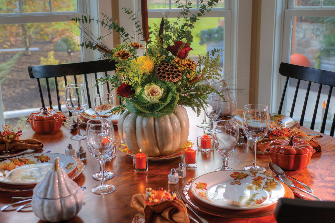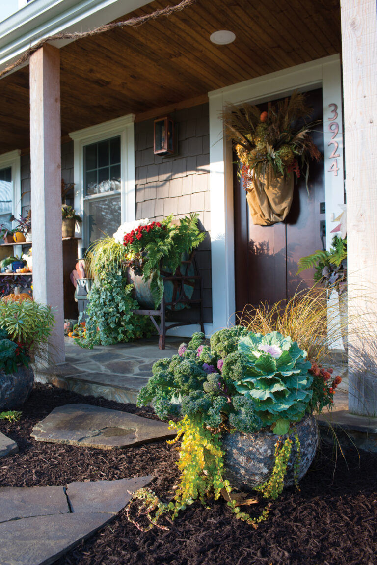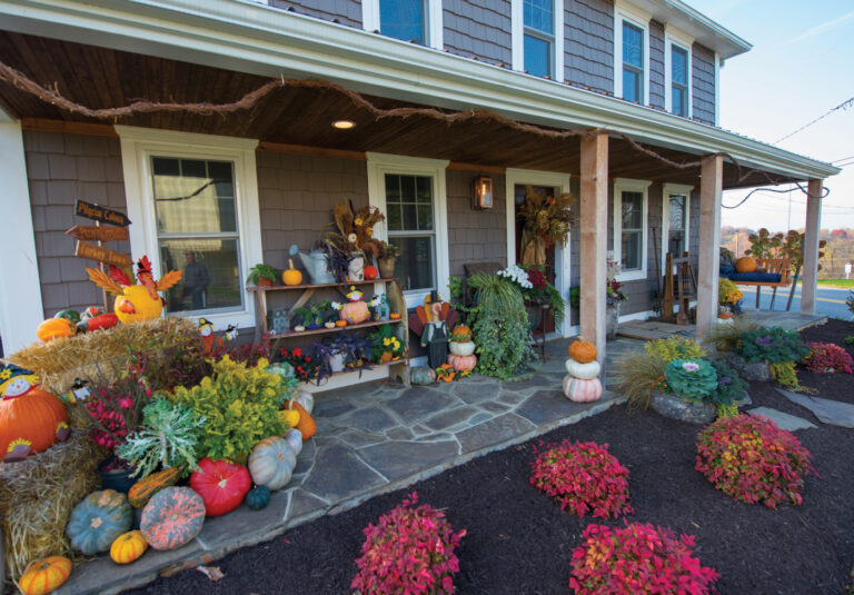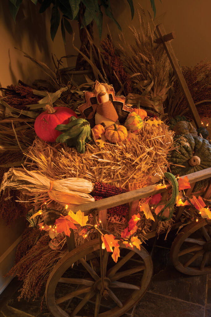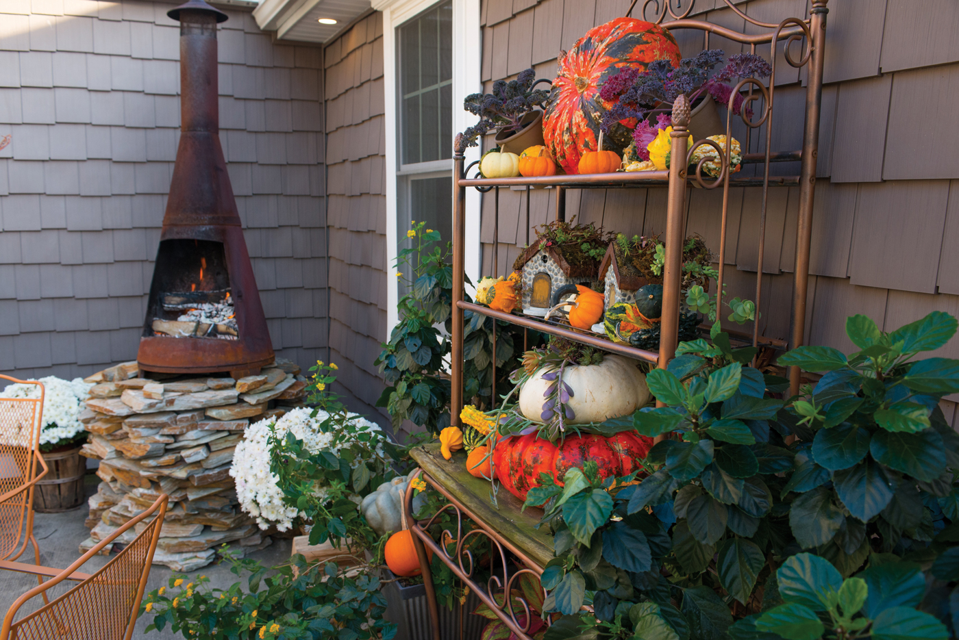 Dozens upon dozens of pumpkins, gourds, plants and finds decorate the porches and patios in October and November. Nathan and Glenn are always on the lookout for decorative items (for all the holidays) during their travels and name antiques shops as a favorite source. “When in doubt, there’s always Amazon!” Glenn says of the turkey feathers he found on the website that can change a Halloween pumpkin into a Thanksgiving turkey.