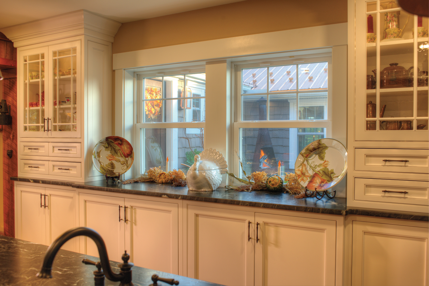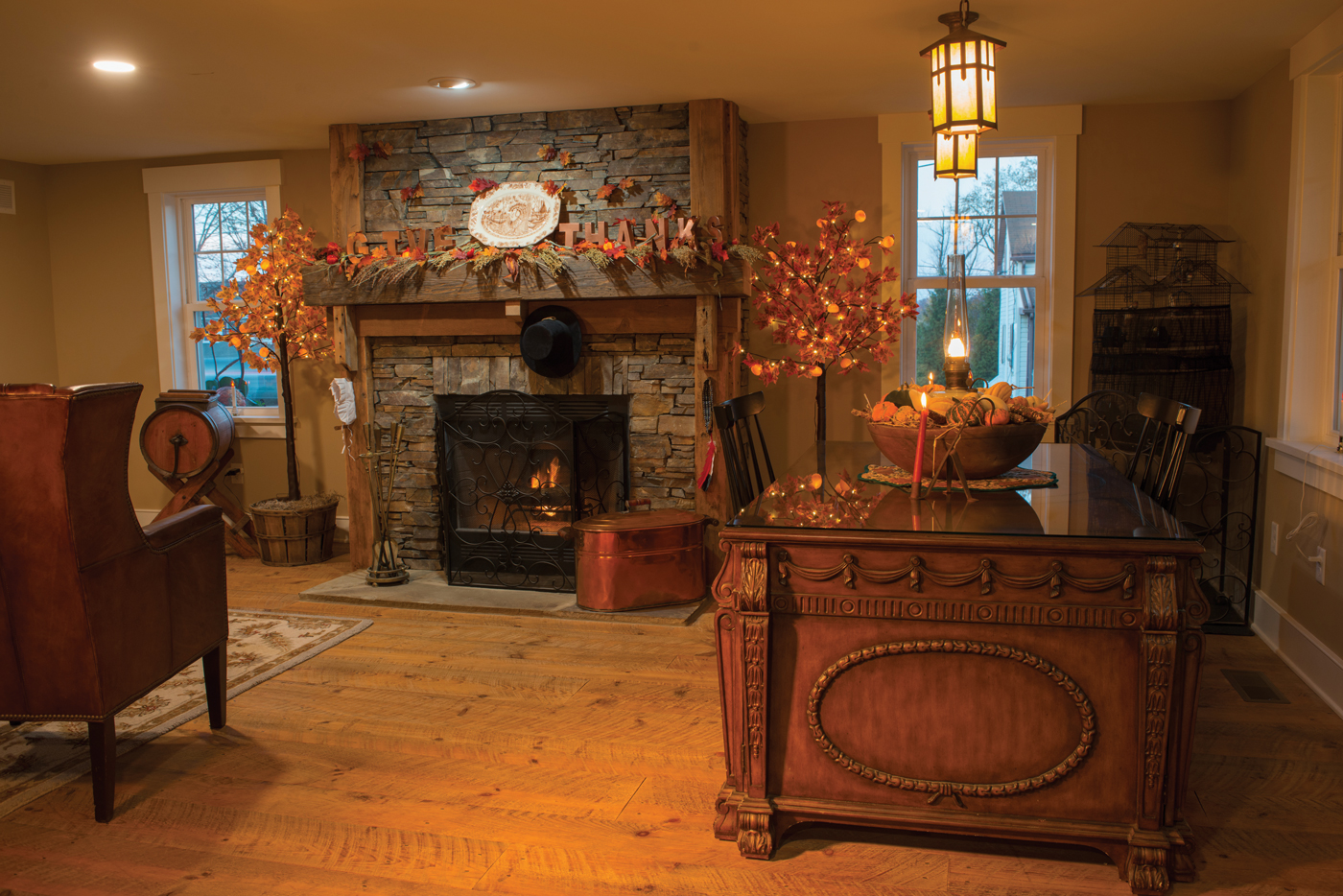 The front rooms of the original farmhouse were also addressed. The first remodel saw the area become dedicated to a dining room, an office and what essentially became a catch-all room. “It really didn’t work,” says Glenn of the divided spaces that were really too small for their intended purposes. Now it’s a wide open space that does triple duty as a sitting area, office and display area for Glenn’s expansive collection of nutcrackers. A fireplace adds to the ambiance.
