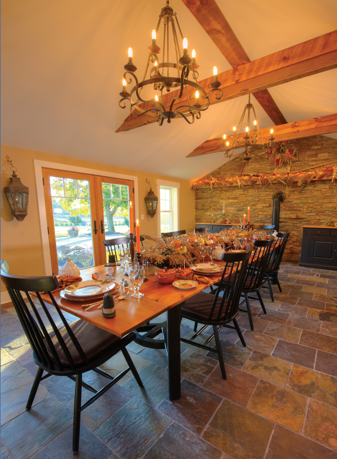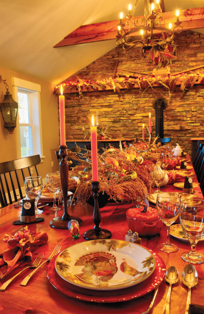 The addition that holds the dining room was finished just before the house was damaged. Fortunately, the slate floor and stone wall were not impacted by the water damage. Nathan’s father crafted the furniture in the room. Here, the room was decorated and the table was set for Thanksgiving 2021.