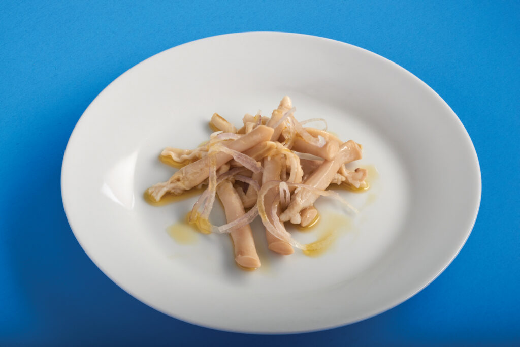 Portomar Razor Clams from Spain, given the Chef Andrew Zimmern treatment with thinly sliced shallots, fresh-squeezed lemon juice and Rincón de la Subbética Olive Oil, also from Spain. The simple plate plays on the senses: luxurious, oceanic, bright, sweet, tangy, crunchy and chewy.