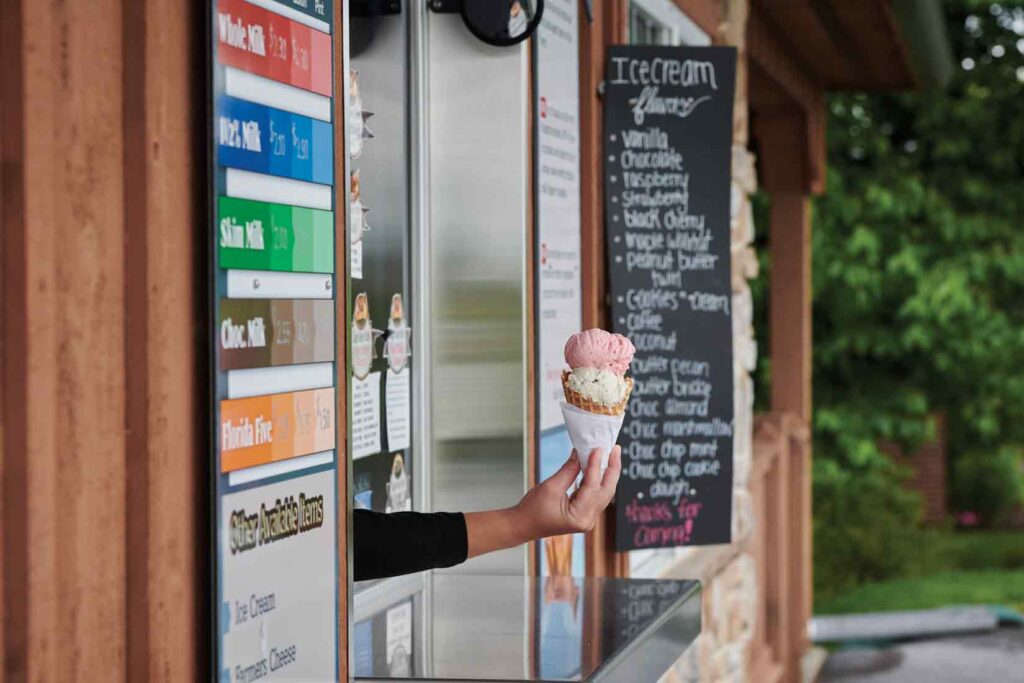 Things have certainly changed since founder Ben Lapp began making ice cream for church services that were held at local campgrounds. The ice cream proved to be so popular that he opened his farm-based shop in 1975. Success prompted the need for a larger facility, which debuted in 2002. The large, wood-clad building features an inviting, plant-filled, wrap-around porch, where tables and chairs entice you to sit for a spell, savor your ice cream and take in the scenery. The porch’s visitors include the farm’s friendly cats.