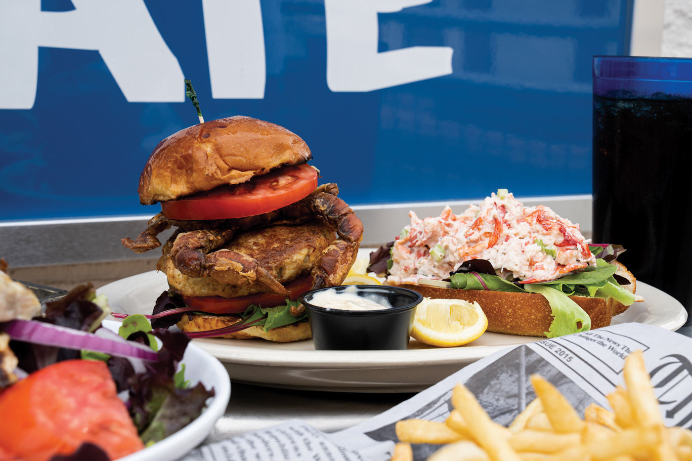 The Fat Crab Sandwich features a crabcake and a soft-shell crab. Lobster Roll is another specialty of the house.