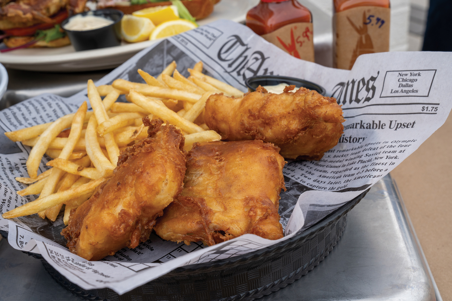 Fish and Chips is comprised of Boston blue (pollock) that is deep-fried and accompanied by crispy French fries.