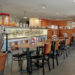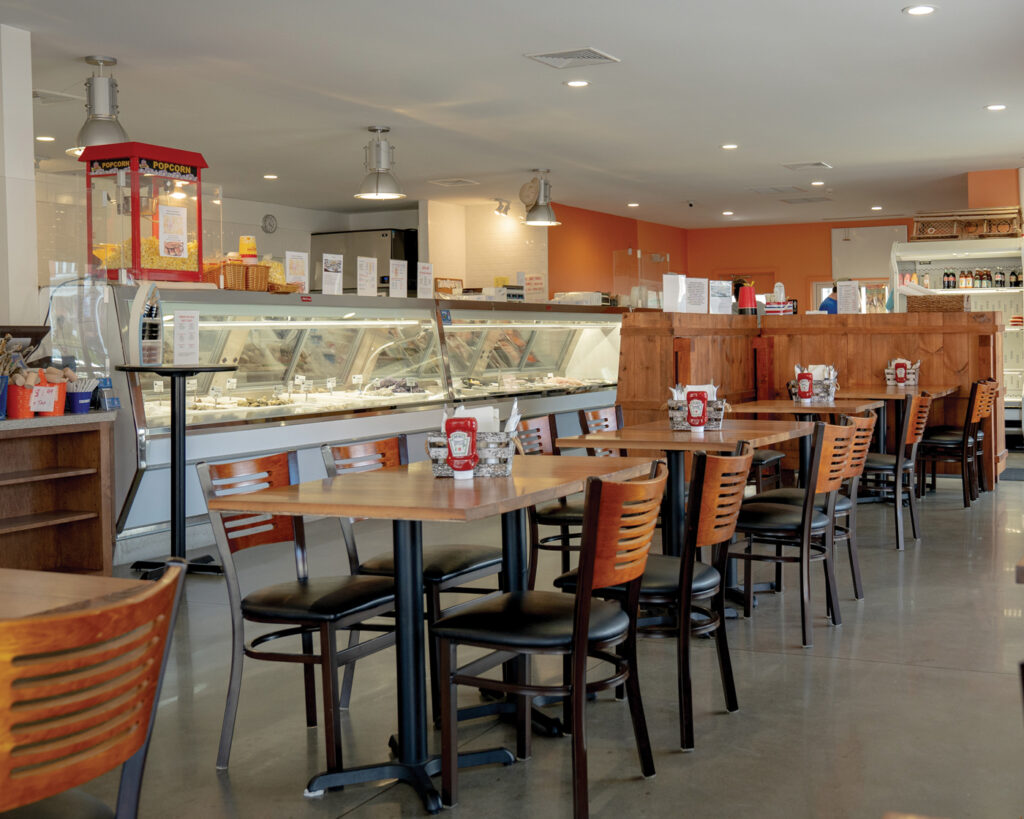 The café seats about 28 inside, where tables and chairs deliver a sleek, modern look. Seasonal outdoor seating is available on a patio, where brightly colored umbrellas and plant-filled containers add a summer feel to the space.