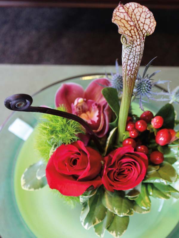 Bring on the air ferns, cactus, succulents, dusty miller, maiden hair fern and other “found” foliage with unique textural qualities! “Some hosts are even working with the foliage only, providing a natural look which invites close inspection to discern the textures and shades of green through gray,” Jill notes. Potted or cut, arranged or collected as a group, texture is the new subtlety.