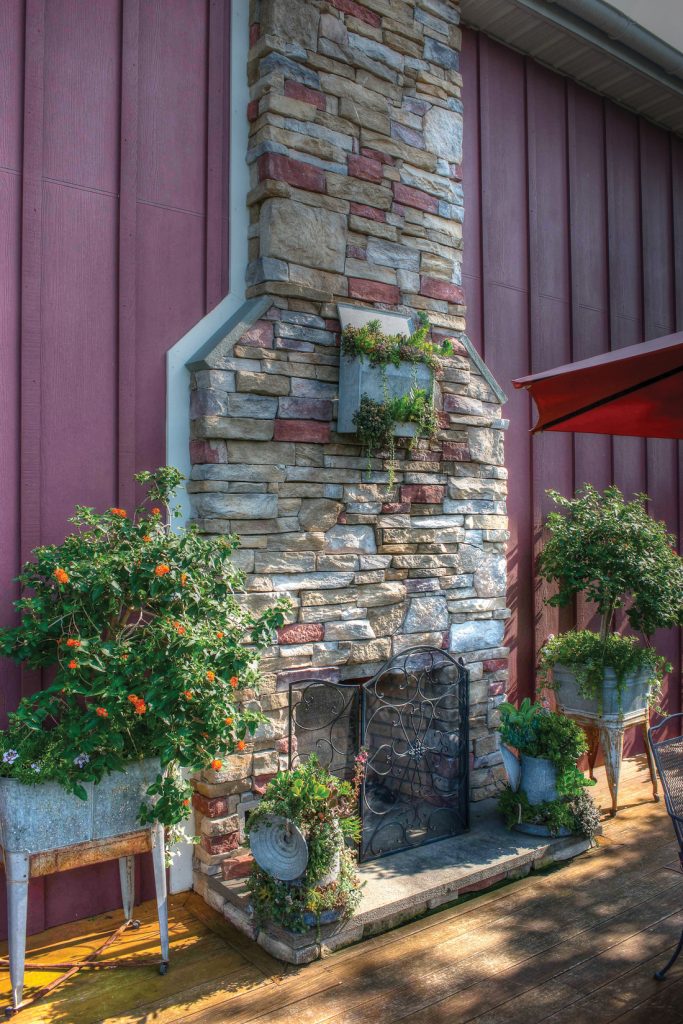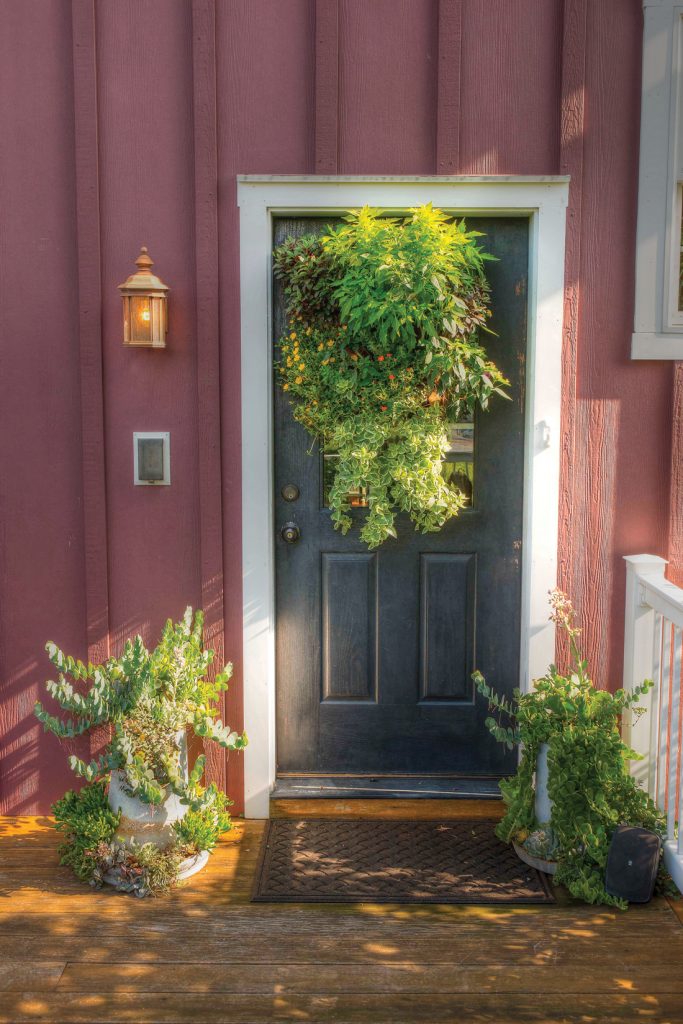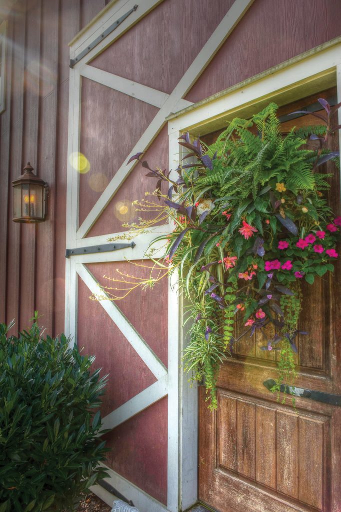 The property seen in this feature is a converted barn that became the temporary residence of Nathan Mountain and Glenn Taylor as a result of their home being flooded after a spring storm. Missing their gardens, Nathan and Glenn, who are regular customers at Tudbink’s, asked Kelsey to help them make their temporary digs feel like home. The plan was to “green-up” the deck and complement the barn with Kelsey’s signature containers. In addition, living wreaths that would add color and texture were designed for the doors. Because everything was mobile, Nathan and Glenn could easily transport the container gardens to their now-renovated home.