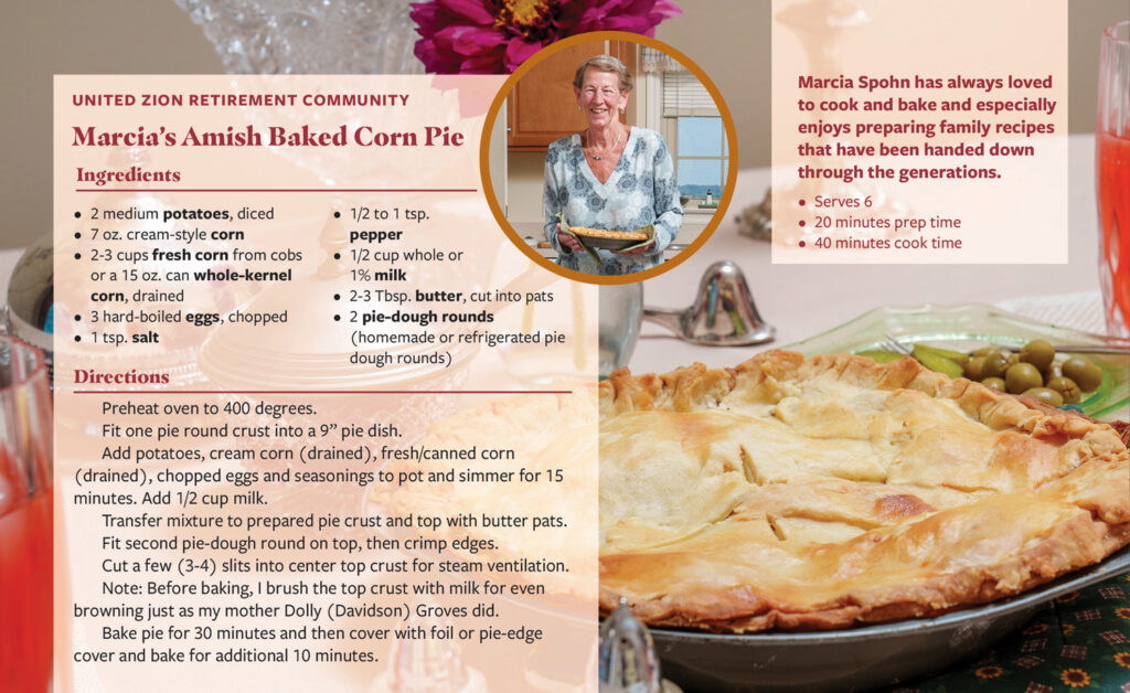 Marcia loves to cook and entertain, while Clarence, who is a history buff, is a long-time member of the Historical Society of the Cocalico Valley and a former educator at the Ephrata Cloister. Their home at United Zion is filled with mementos from their previous home, as well as their travels. As residents of United Zion, they love living in a small community where everyone is regarded as a neighbor. They were joined by their friend and neighbor, Rosene Garman, for lunch that featured one a Marcia’s favorite family recipes, Amish baked corn pie.