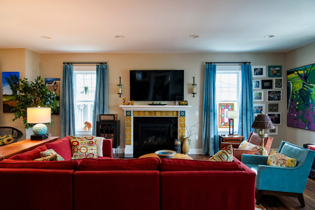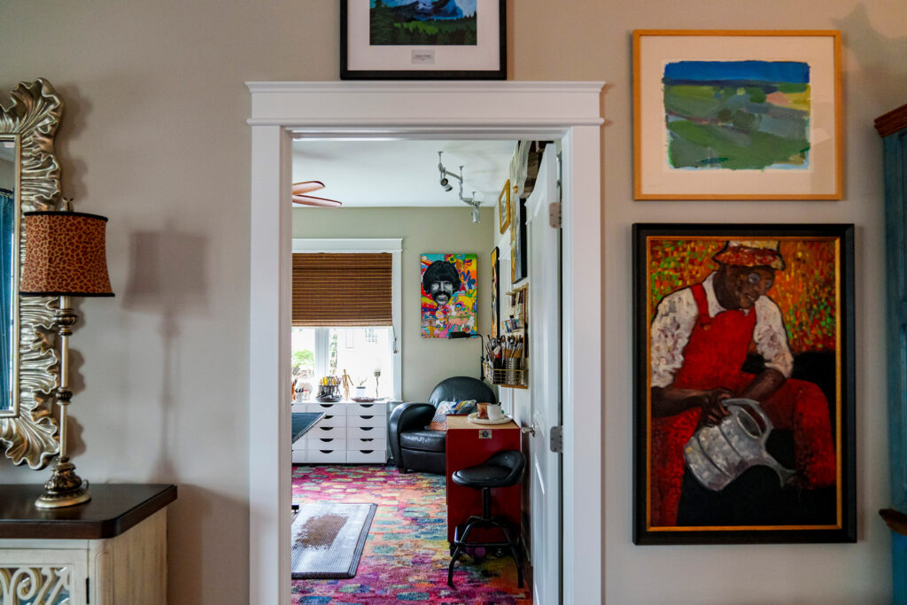 Art that exudes vivid colors fills the walls. Color also radiates from the furnishings, rugs and window coverings. Everywhere you look, something commands your attention.