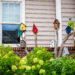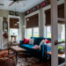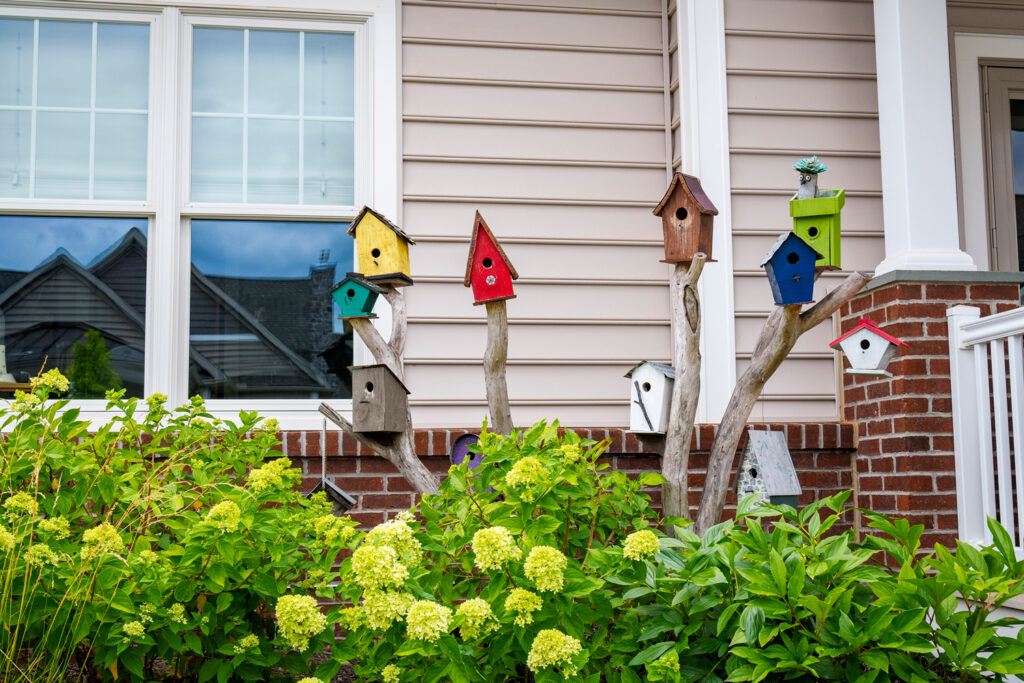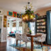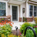 The color story and artistic touches continue outdoors, where the cozy front porch is accessorized with colorful art and pillows. In the gardens, plants bloom in vivid colors and items like birdhouses and driftwood qualify as art.