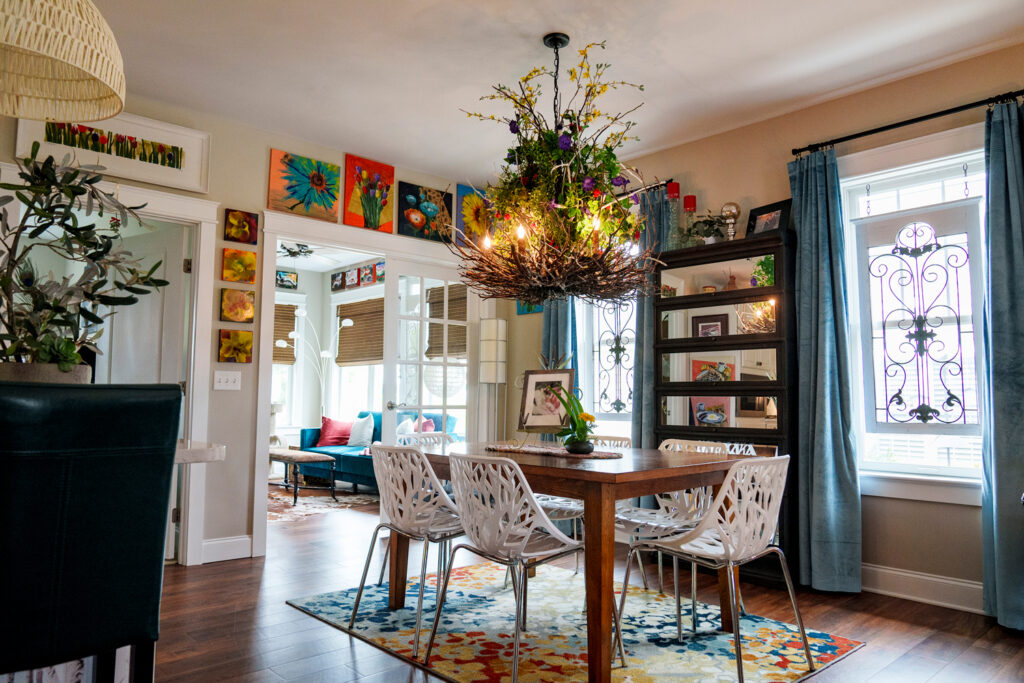 When it came to decorating their home, Fred’s artistic talent and Valerie’s interior design capabilities combined to create a colorful and interesting living space. The den, which exhibits a “Mount Gretna” theme, pays homage to the town they will always love. The dining area has a gardenesque ambiance thanks to the floral art that embellishes the chandelier. Valerie saw the floral “arrangement” years ago at Festoon’s Belmont location and told owner Kathy Frey that when she was ready to sell it, to call her.