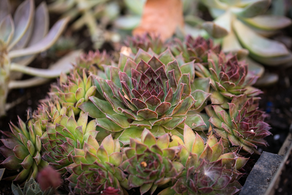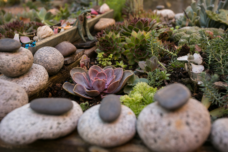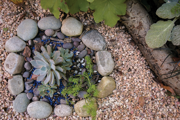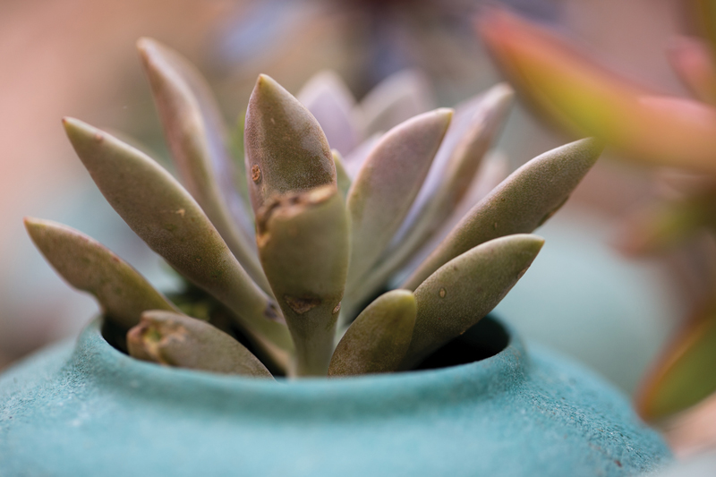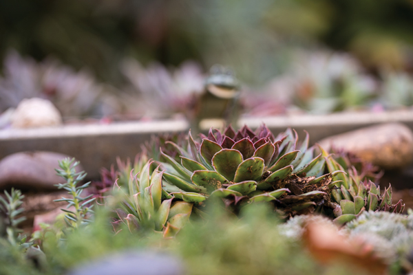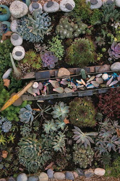 The center of the garden is dedicated to a raised bed in which succulents grow. Pots containing more succulents surround it. She discovered the allure of succulents while traveling through the Southwest. “Succulents are really popular out West because they are drought-resistant,” she reports. “I like them because they look like little sculptures, and they lend themselves to a variety of uses.” Victoria uses the succulents she grows for her floral-design projects and to create living heirloom jewelry. When the weather turns cold, she moves them to a sunny room on the second floor.