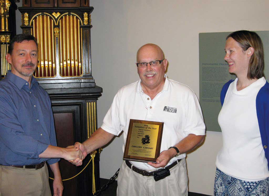 As a nonprofit, the Watch & Clock Museum and the Library & Research Center of the National Association of Watch & Clock Collectors (NAWCC) rely on volunteers to keep their operations running. In 2013, more than 50 of the museum’s dedicated volunteers gave nearly 6,000 documented hours. Of those 50+ volunteers, one in particular was honored as Volunteer of the Year for his outstanding generosity and length of service: Gregory Gerhart of Marietta.
